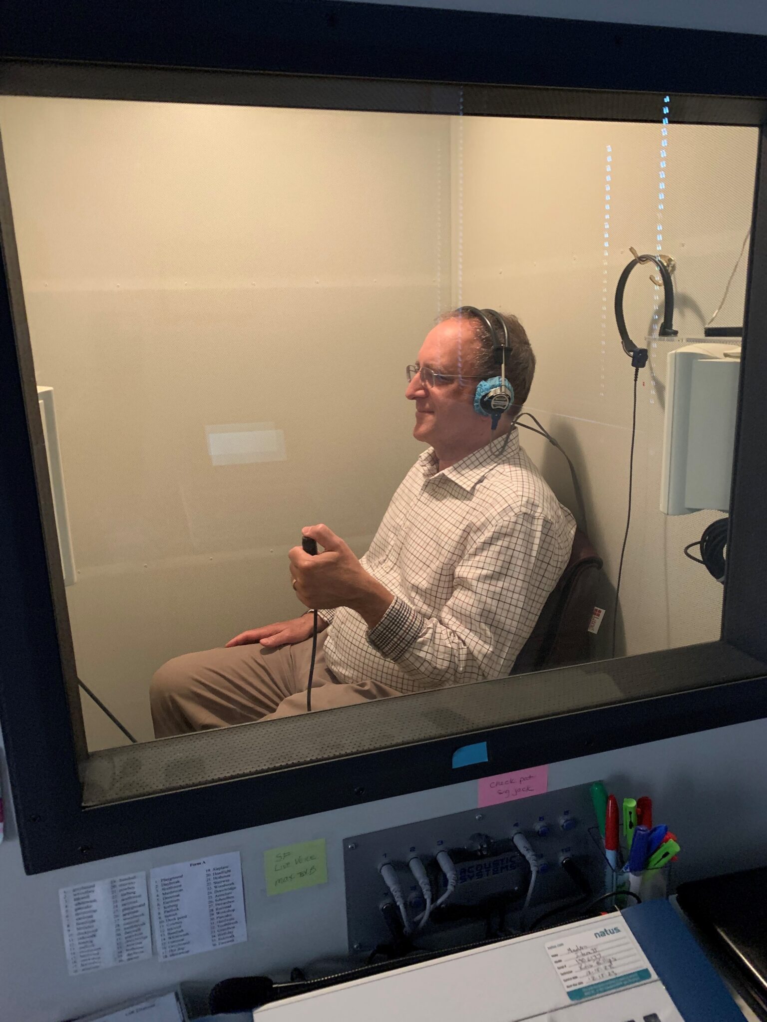 I went into the testing booth. It’s the opposite of an echo chamber; there is no sound at all, except for what comes in over the headphones. The test involves listening to a number of words and phrases (or sounds) and noting if I can actually hear them. If I could hear the word or sound, I would click the little button in my left hand. This went on for several minutes.